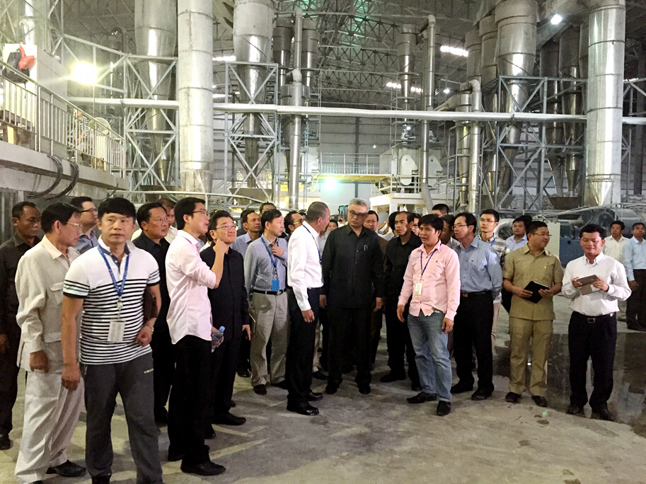 當(dāng)天下午,Aun Porn Moniroth部長一行在會議室聽取了公司情況介紹,觀看了公司企業(yè)文化宣傳片。公司總經(jīng)理程云向部長匯報了柬埔寨爾康的基本情況。他說,柬埔寨爾康目前已投資了兩個項目,一是年產(chǎn)18萬噸的淀粉生產(chǎn)項目,二是年產(chǎn)5萬噸的檸檬酸鈉生產(chǎn)項目。目前兩個項目均以柬埔寨當(dāng)?shù)氐哪臼頌樵?,這對柬埔寨農(nóng)業(yè)的發(fā)展有著極其重要的意義。